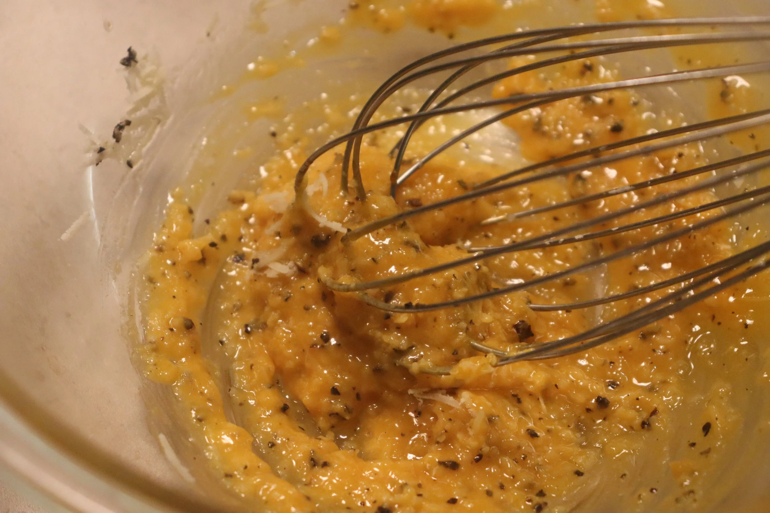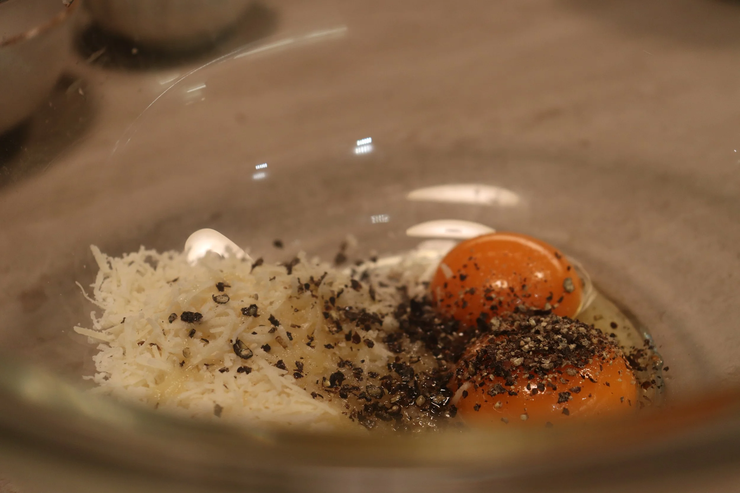 Make the sauce base – In a bowl, whisk together the egg yolks, a generous handful of grated Parmigiano Reggiano, and freshly ground black pepper, pancetta excessed fat until creamy.