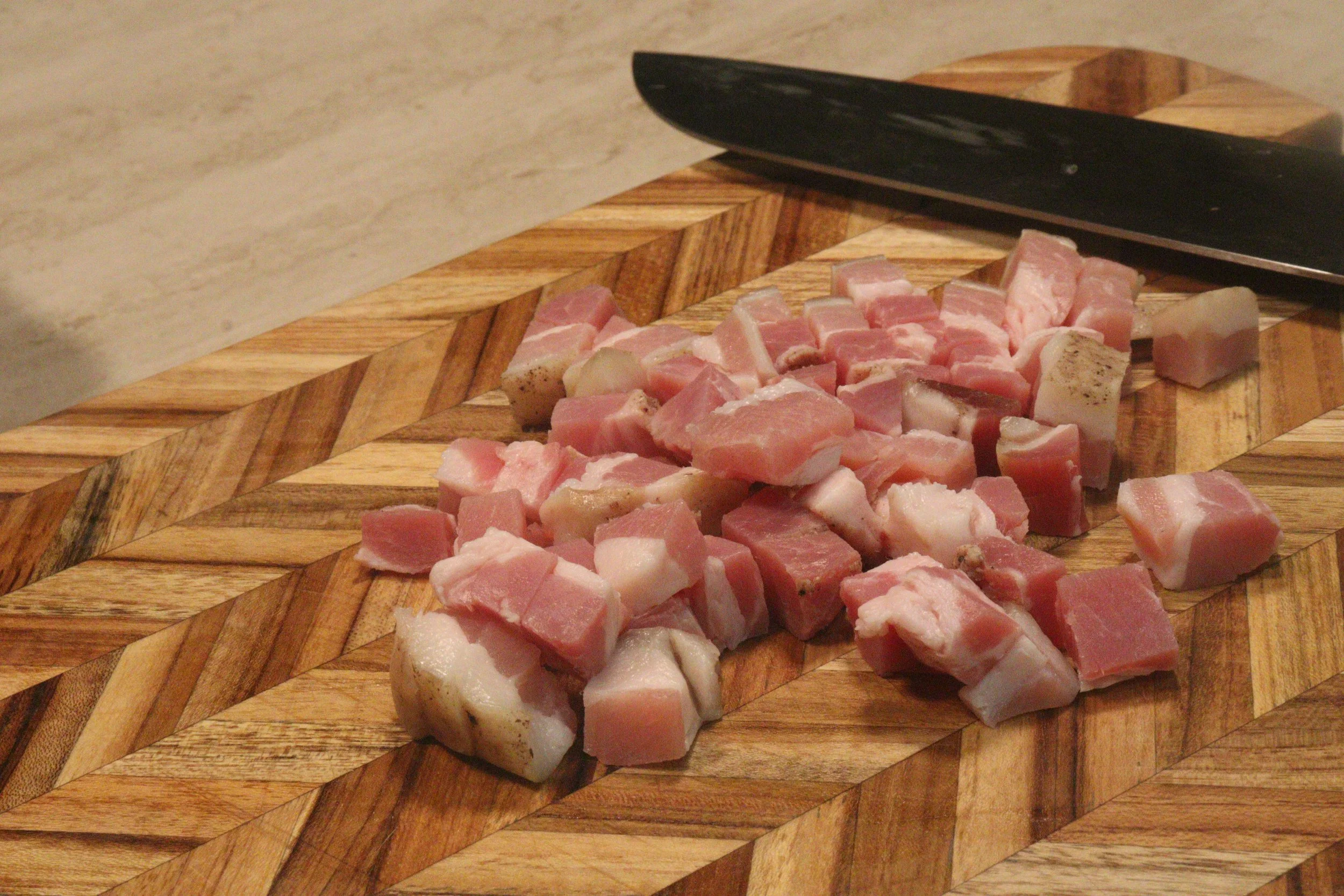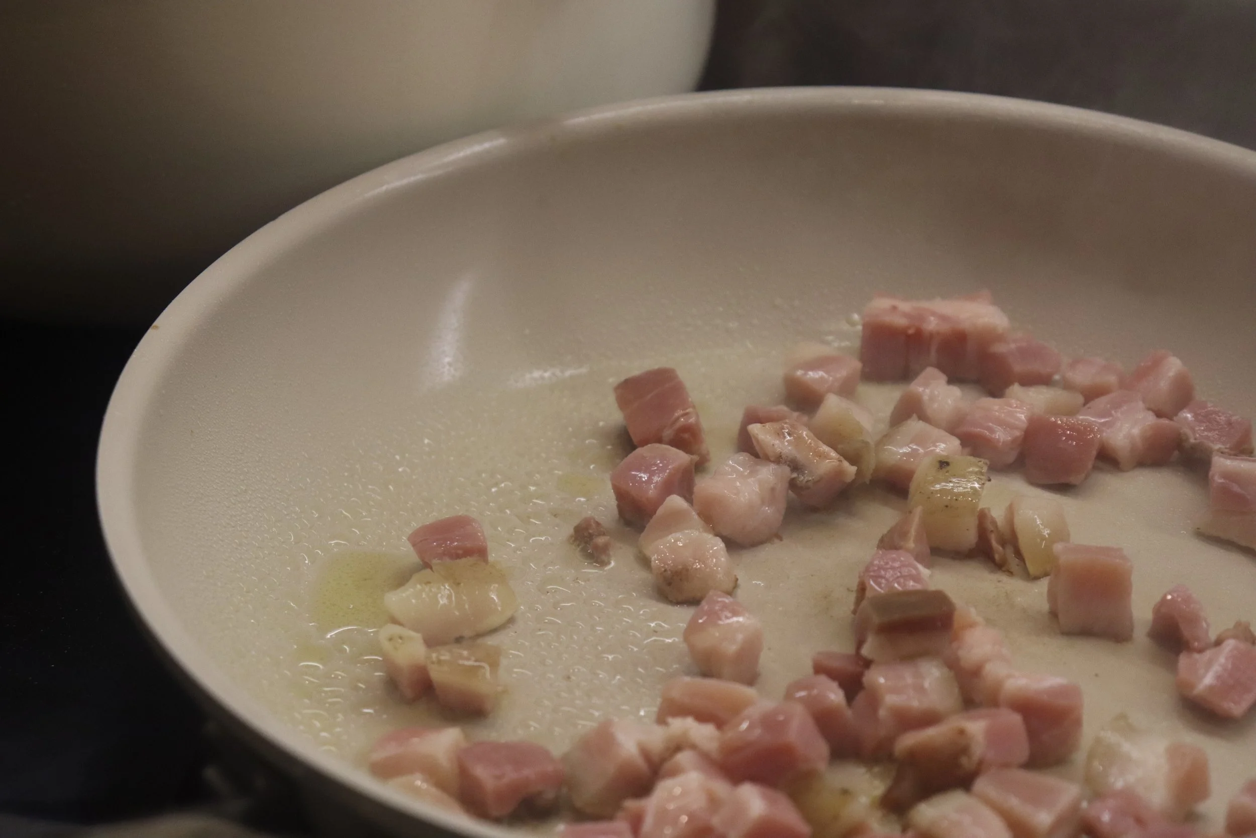 Prepare the pancetta – In a large pan, cook the diced pancetta over medium heat until golden and crispy. Turn off the heat and set pancetta aside from the fat ( i add a drizzle of olive oil while cooking).