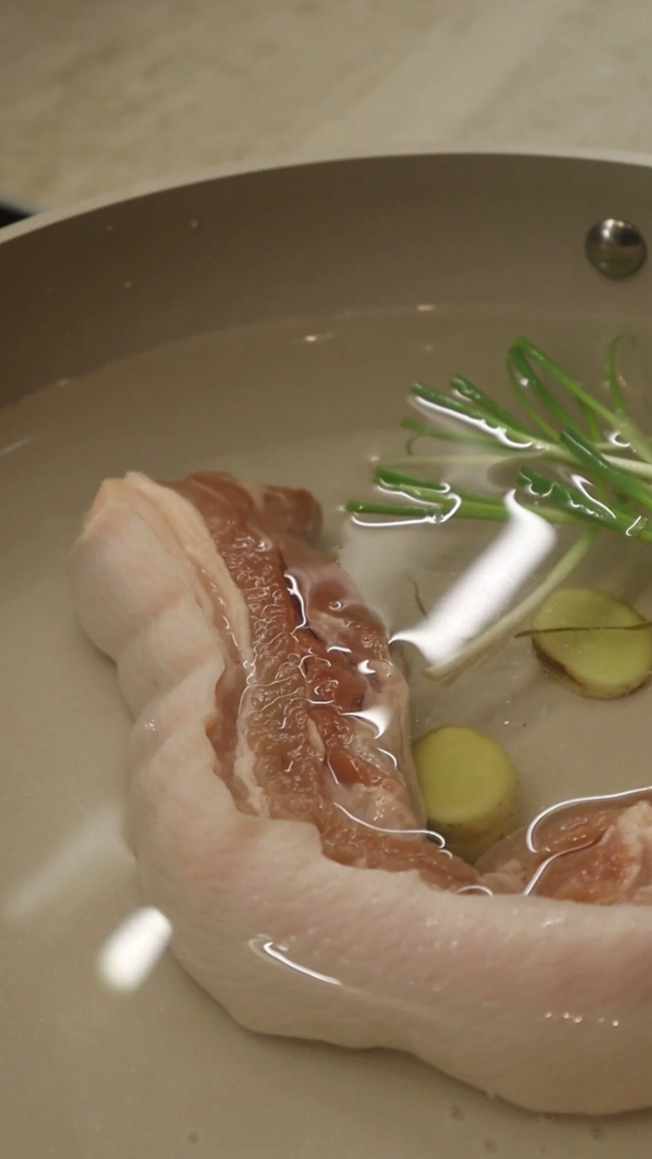 Boil the pork belly: In hot water, add ginger, scallion, sugar, salt, and vinegar. Cook pork belly on medium heat for 20–30 minutes until tender, the meat all cooked through.