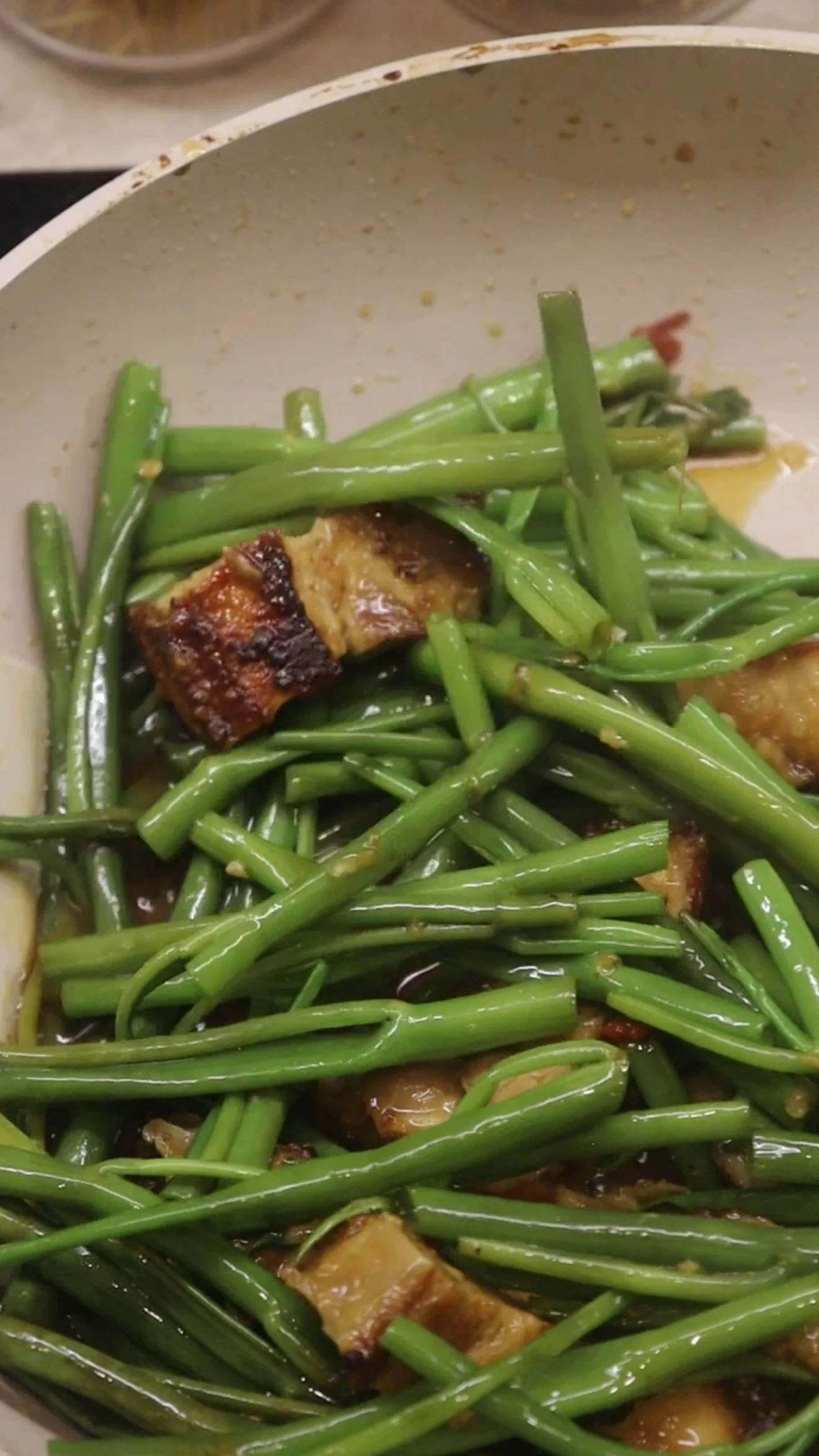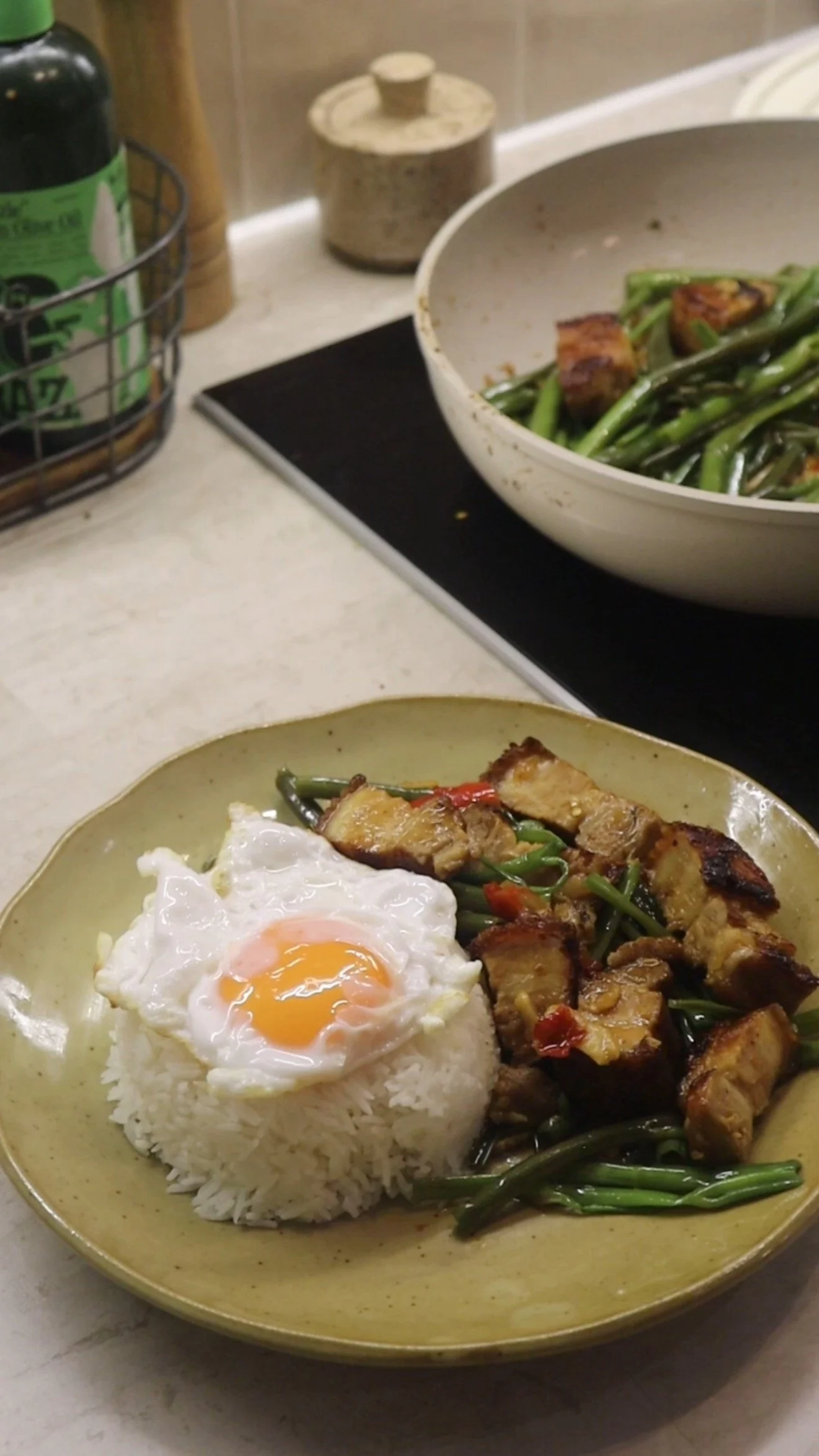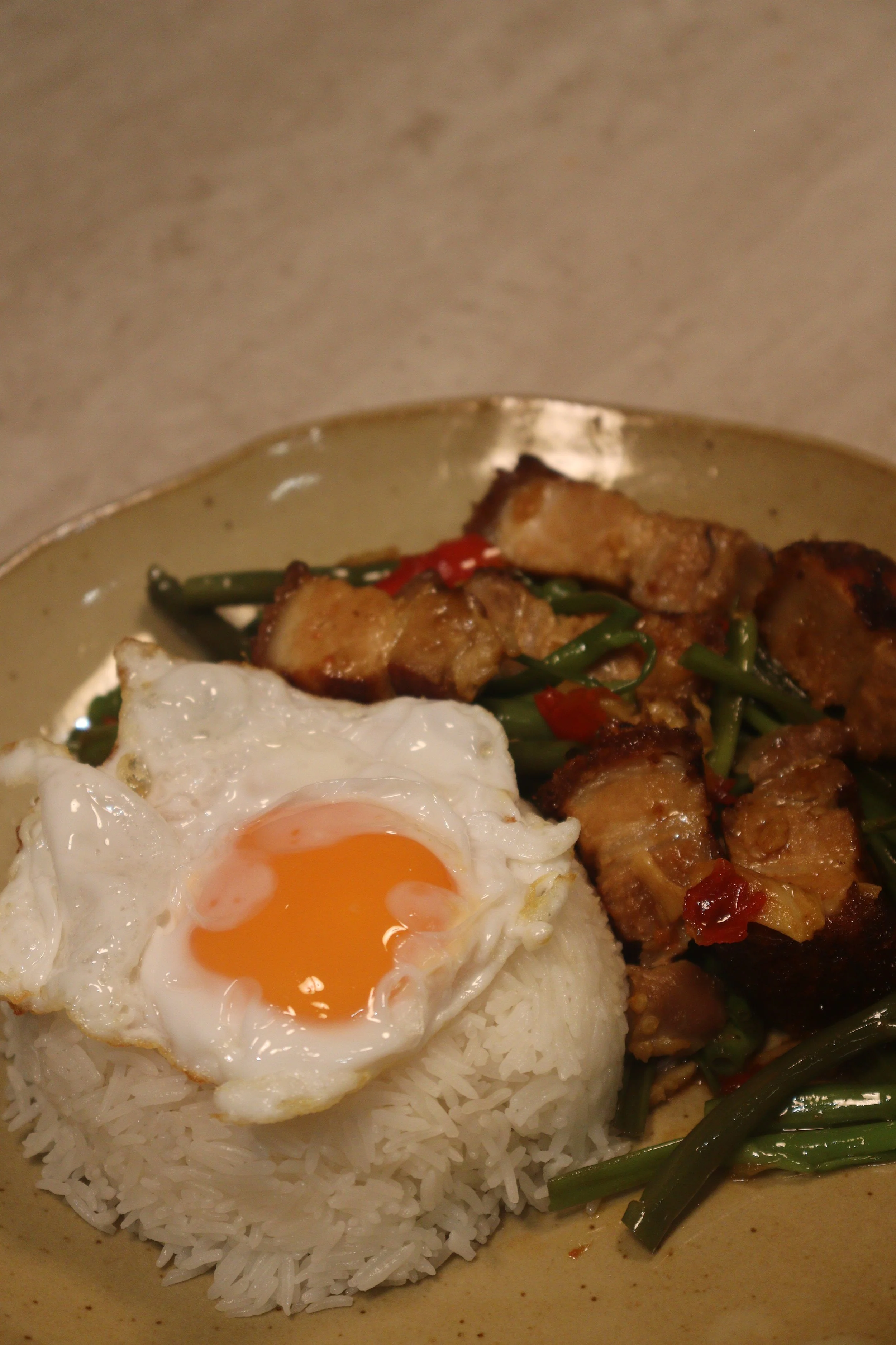 This dish is all about balance—the richness of the pork belly against the freshness of morning glory ( or water spinach) , all tied together with chili, garlic, and savory sauces. Simple enough for a busy weeknight,still feels like a special treat with a bowl of rice and a fried egg on top.