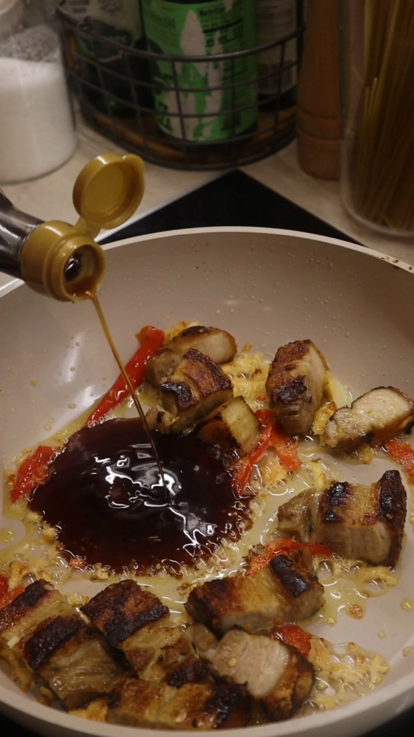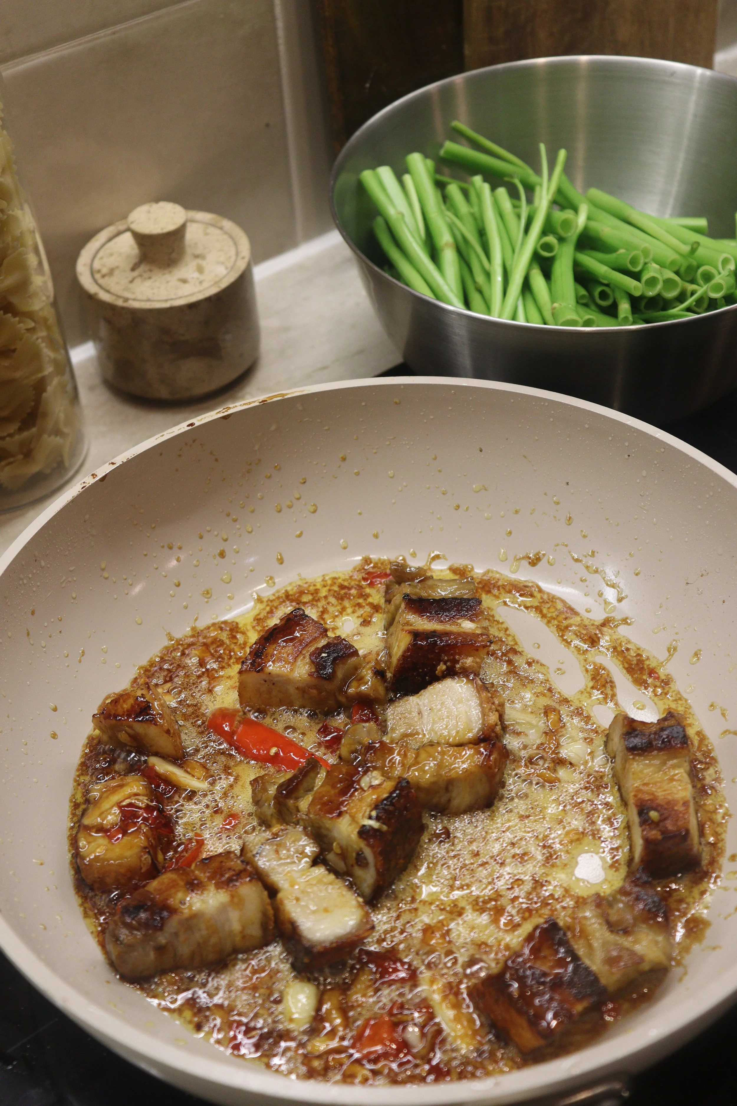 Stir-fry the sauce: In a hot pan, sauté garlic and chili until fragrant. Add pork belly cubes, soy sauce, oyster sauce, and sugar.