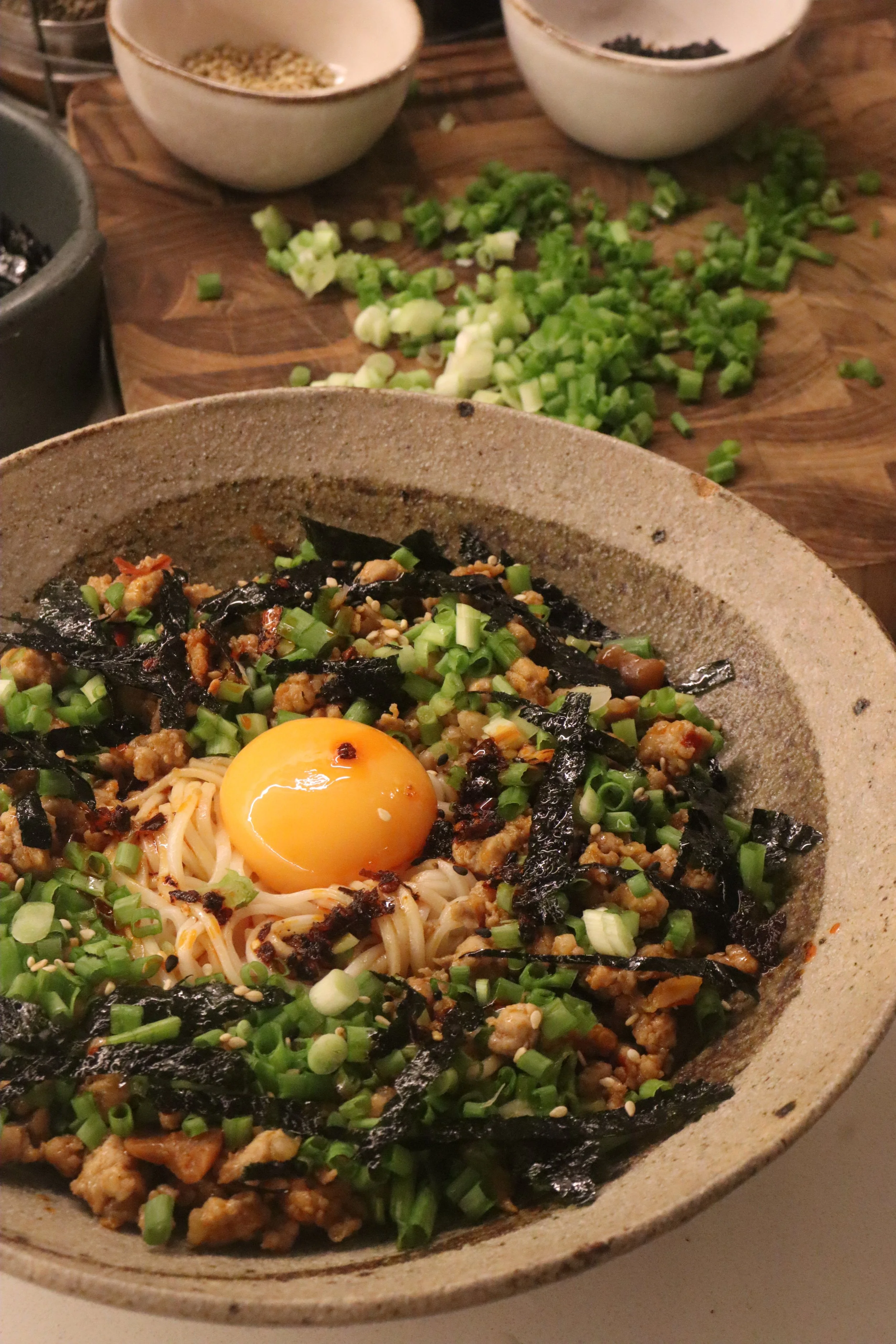 Before eating, mix everything thoroughly so the egg yolk coats the noodles and blends with the toppings.