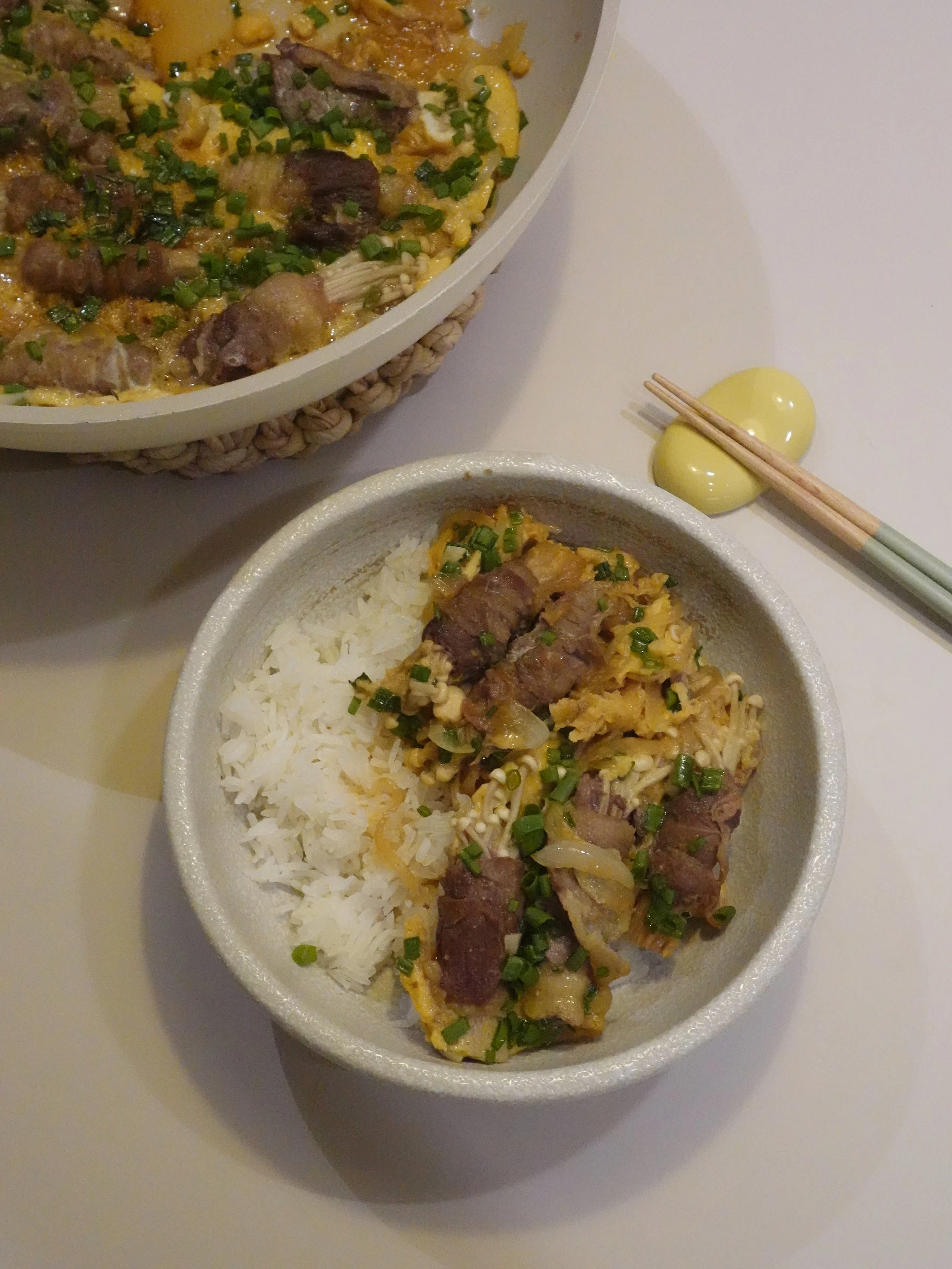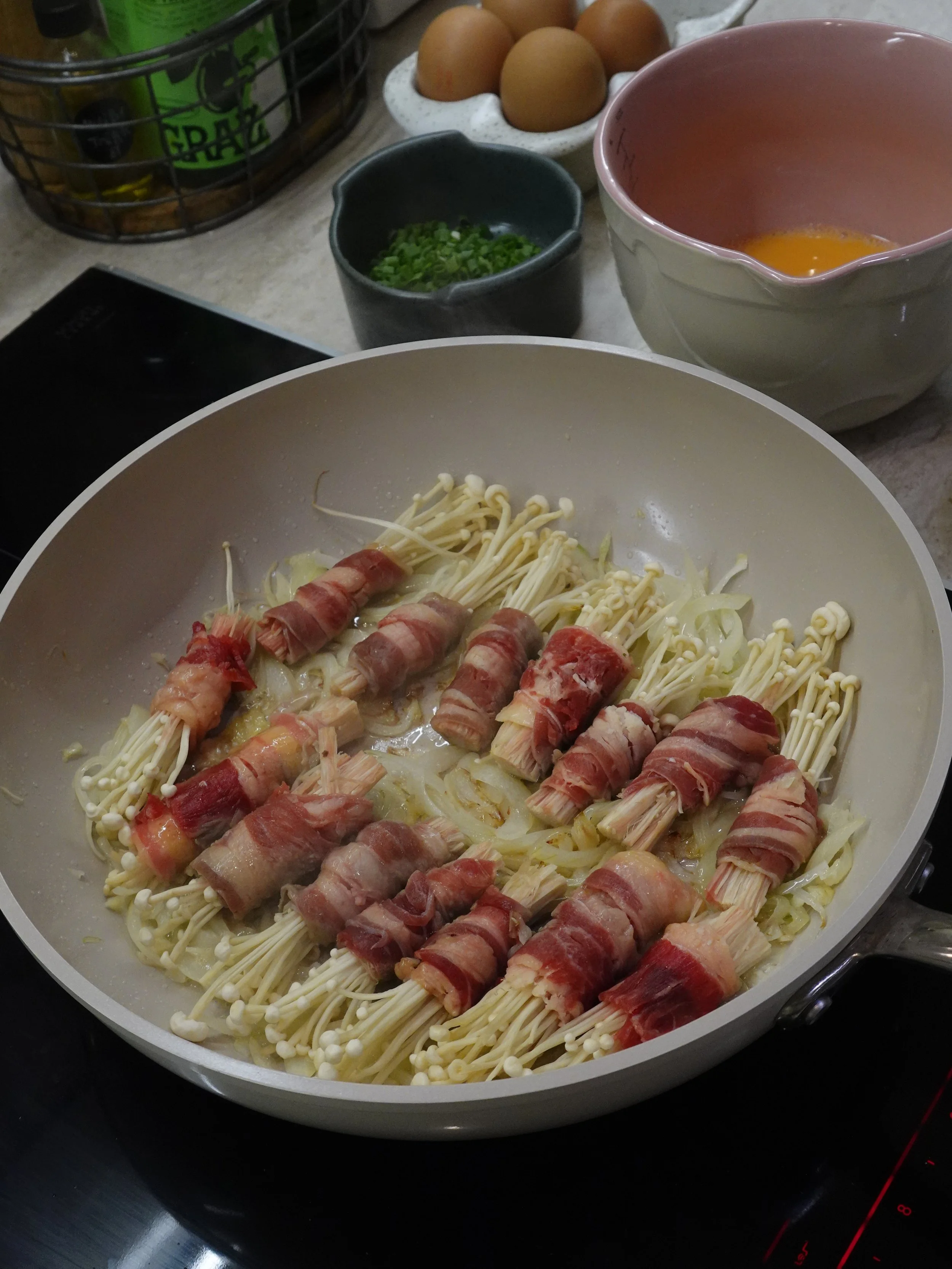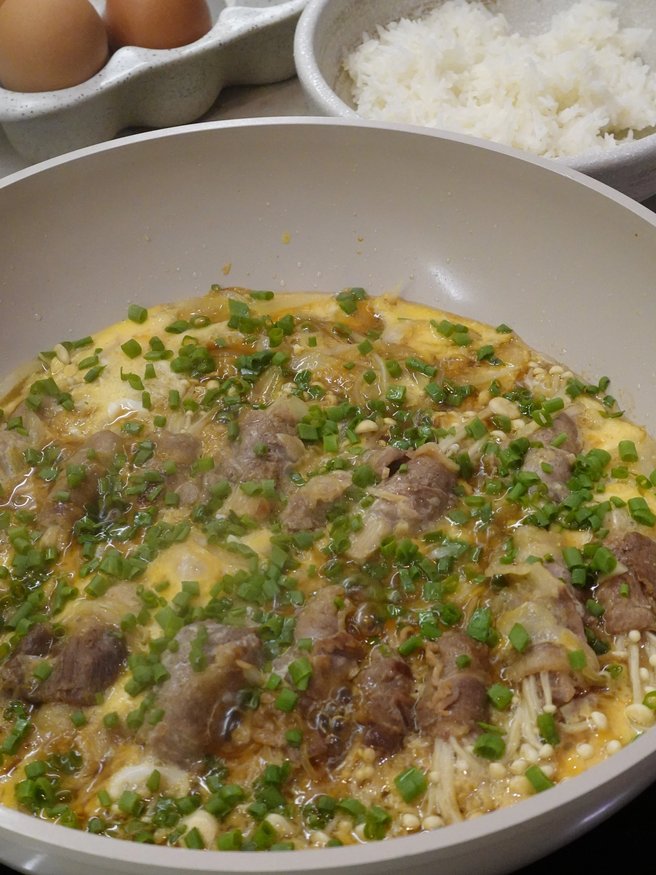 It takes barely any effort: roll thin beef slices around enoki mushrooms, sear them, pour in a simple soy–mirin sauce, then finish with eggs. In just a few minutes, you get juicy beef, crunchy mushrooms, and soft eggs soaking up all that sweet-savory flavor.
