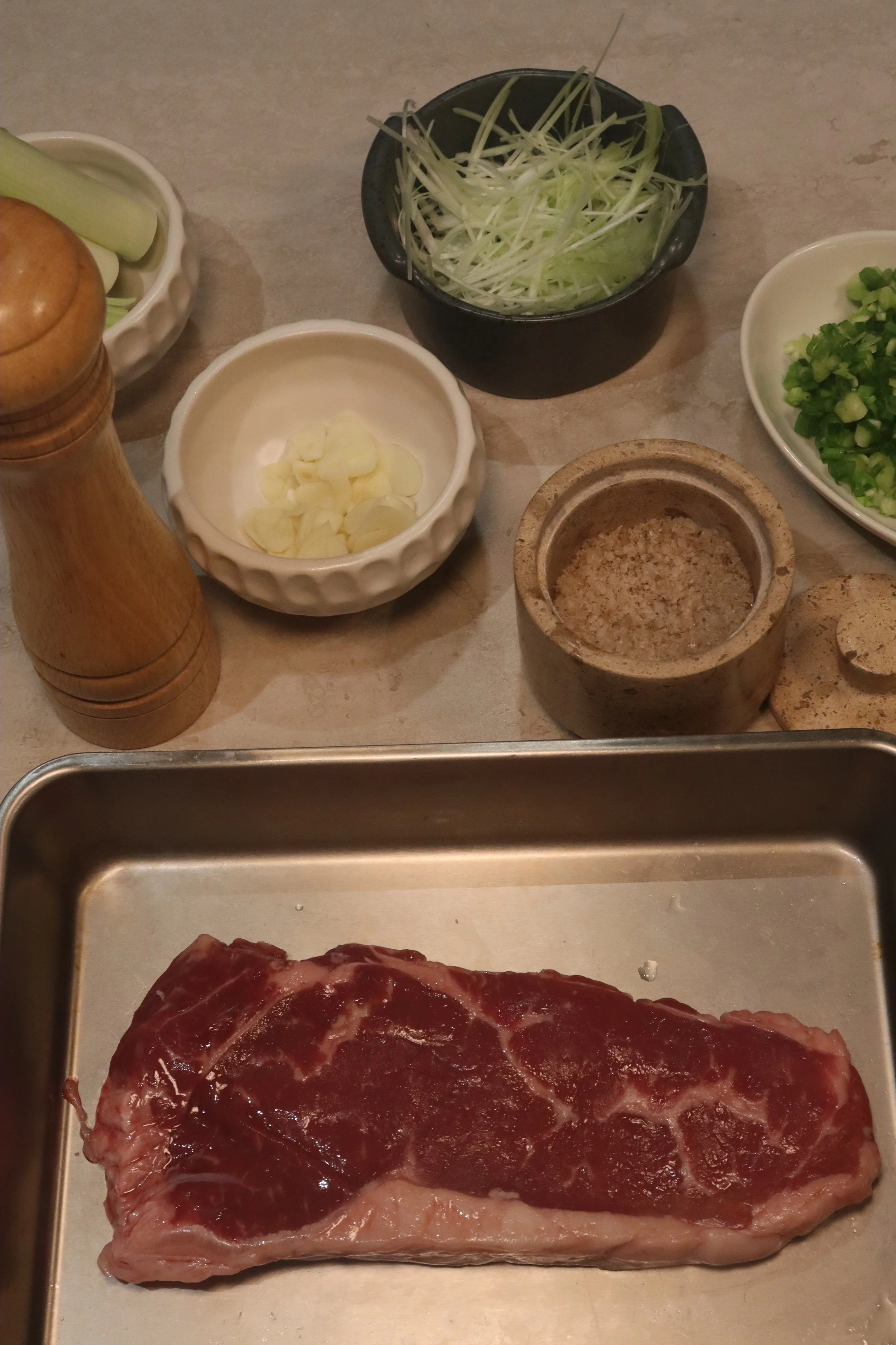 Seared steak: Season with salt and pepper, then pan-sear to medium rare (use the same pan from frying garlic & leek for extra flavor). Add a knob of miso butter for aroma. Rest the steak, then slice.