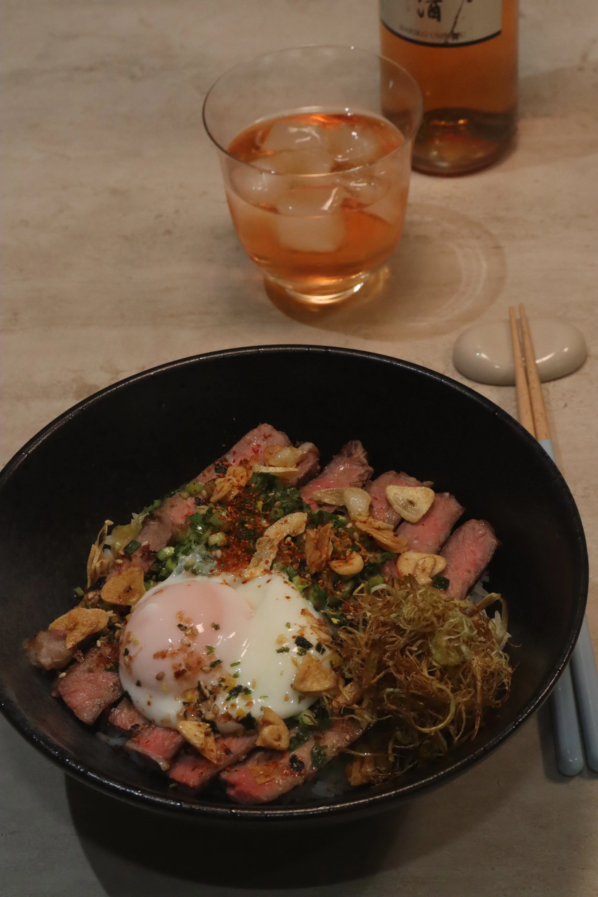 Assemble: Rice → steak slices → scallion-wasabi oil → onsen egg → finish with furikake, crispy garlic, leek, and a sprinkle of shichimi.